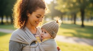 É justamente nesse contexto que recursos de aproximação podem ajudar as famílias no dia a dia.O sling por exemplo é uma forma de carregar o bebê que favorece o contato contínuo com o corpo do cuidador. Essa proximidade contribui para a liberação de hormônios como a ocitocina, associados ao bem-estar e à sensação de segurança. Muitos pais percebem que, quando estão no sling, os bebês dormem com mais facilidade, choram menos e apresentam uma postura mais relaxada. Por suprir a necessidade de aconchego, o sling frequentemente reduz a busca compulsiva pela chupeta como forma de conforto.
